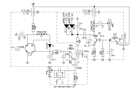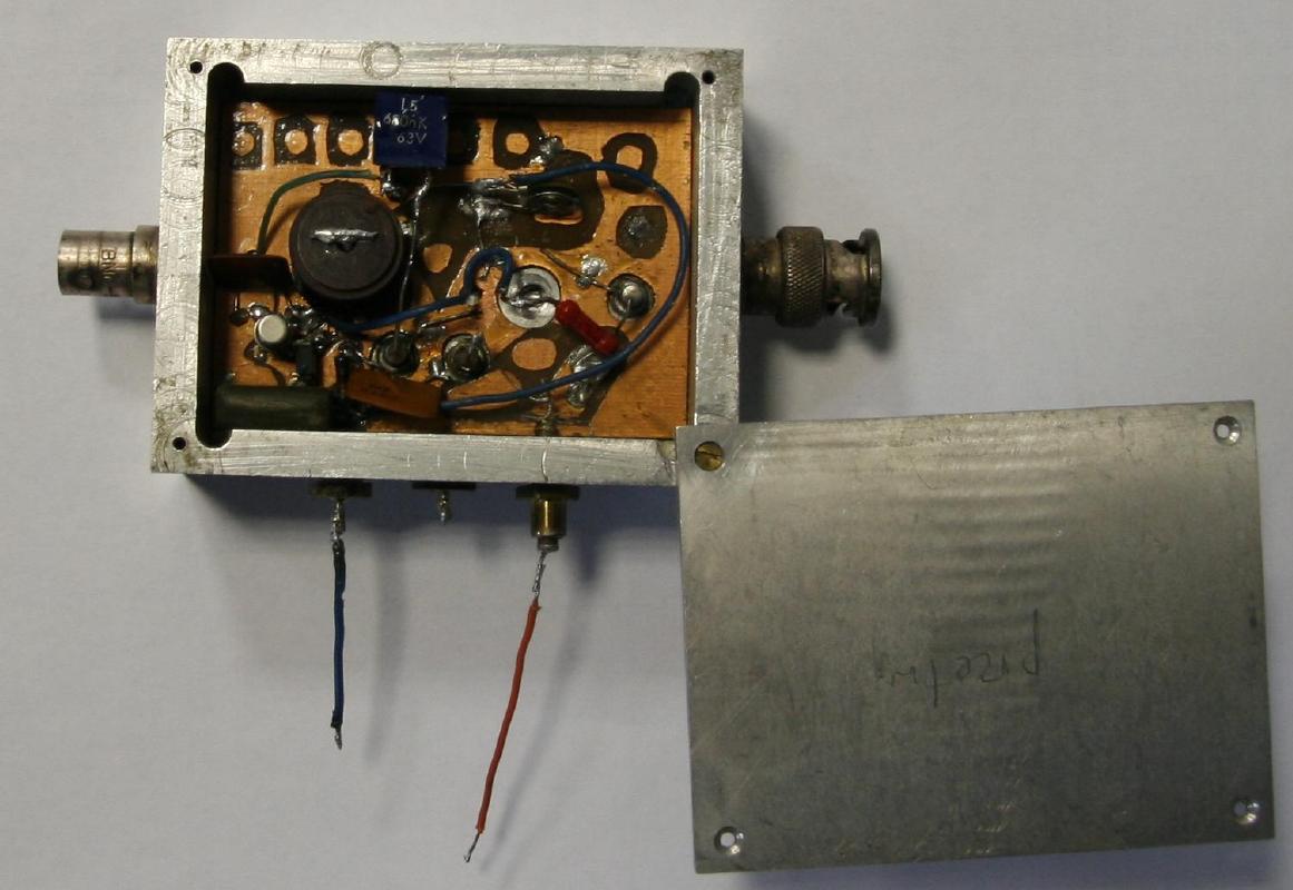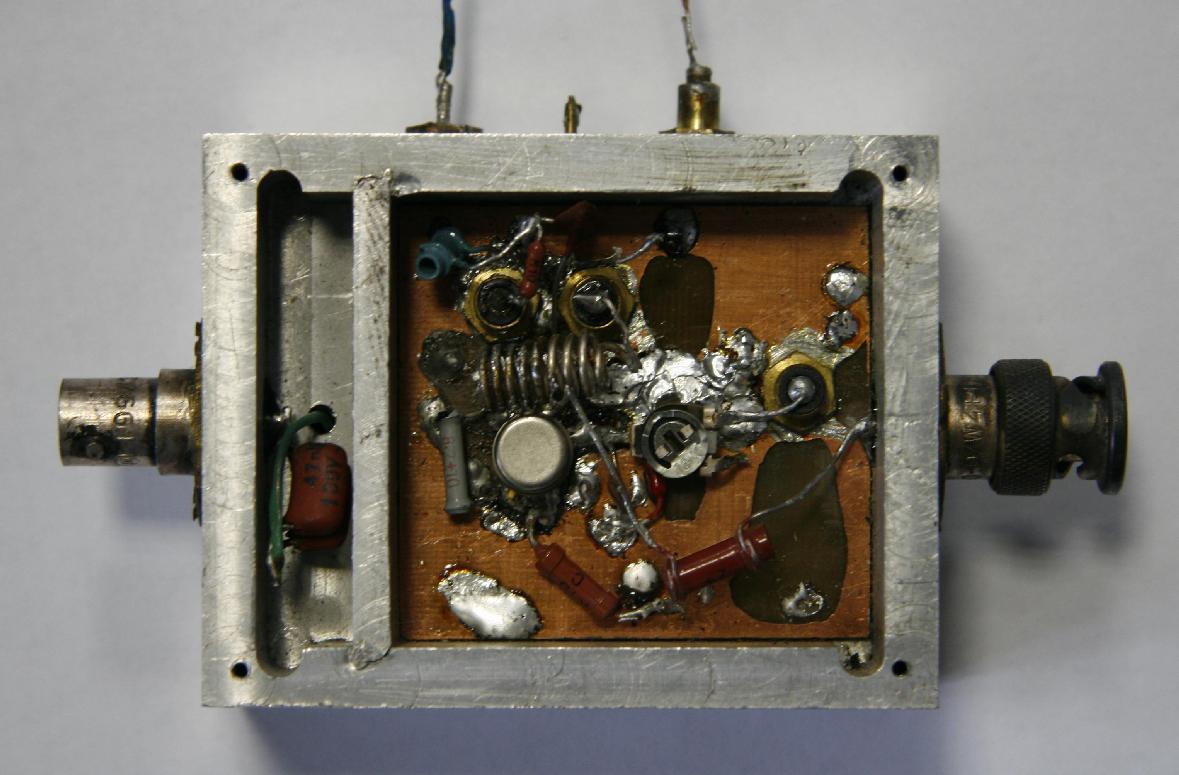Nadajnik ma najprostszą możliwą konstrukcję: składa się z jednego tranzystora małej częstotliwości BC 211. Większość katalogów określała jego maksymalną moc na 0,8 W, ale w jednym przeczytałem, że może to być nawet 3,5 W (w załączonym opisie jest mowa nawet 0 4,25 W, oczywiście przy idealnym chłodzeniu). Nie pamiętam ile mocy doprowadzałem w praktyce do generatora, chyba ok. 1-2 W, może więcej. W jednej z komór aluminiowego pudełka, które dostałem od Pazderskiego umieściłem też przetwornicę do sterowania diodami pojemnościowymi i inne układy pomocnicze. Strojenie i modulacja odbywały się przy pomocy diod pojemnościowych.